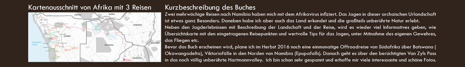 Bevor das Buch erscheinen wird, plane ich im Herbst 2016 noch eine einmonatige Offroadreise von Südafrika über Botswana ( Okawangodelta), Viktoriafälle in den Norden von Namibia (Epupafalls). Danach geht es über den berüchtigten Van Zyls Pass in das noch völlig unberührte Hartmannvalley. Ich bin schon sehr gespannt und erhoffe mir viele interessante und schöne Fotos.